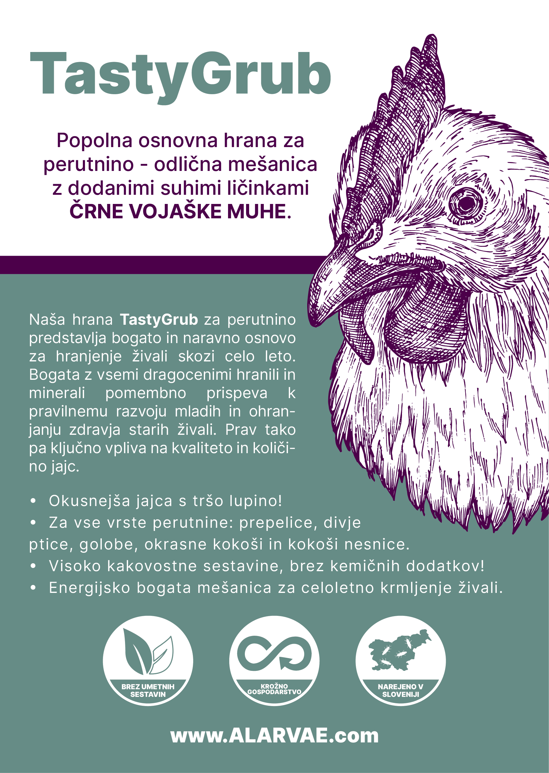 Zdrav aminokislinski profil, lahko prebavljive živalske beljakovine žuželk in veliko kalcija - za naravno proizvodnjo jajc in močne jajčne lupine!